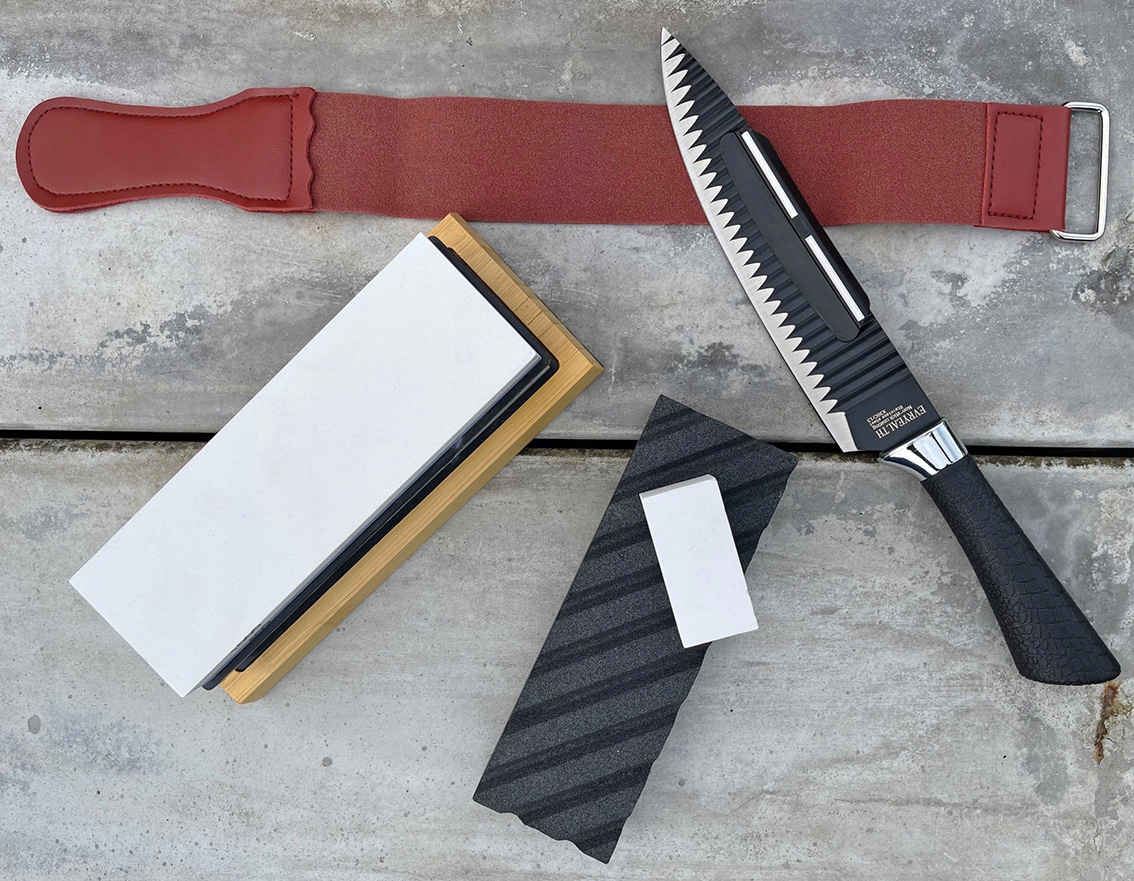 Dodatkowo w zestawie jest też PAS SKÓRZANY, którym można ostrzyć noże, ale przede wszystkim BRZYTWY.
