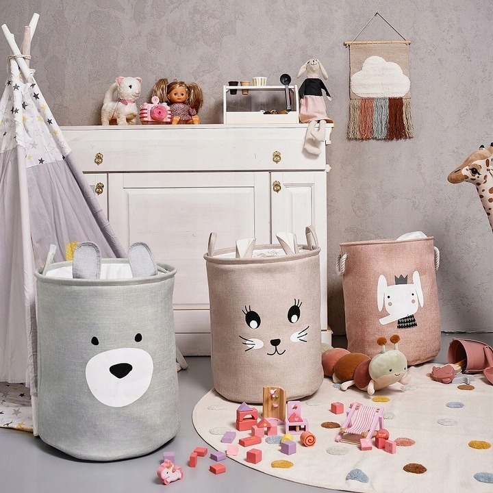 Pojemny kosz o pojemności 63 litrów pozwala przechowywać zabawki, pluszaki i ubrania w jednym miejscu. Wzmocniona konstrukcja, zamknięcie na ściągacz oraz mocne uchwyty sprawiają, że jest wygodny i trwały w codziennym użytkowaniu.