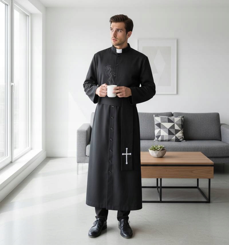 ➡️ Sutanna – Długa, czarna sutanna, która od razu przywodzi na myśl tradycyjny strój duchownego. Wykonana z lekkiego, oddychającego materiału, zapewnia komfort przez całą noc. Sutanna jest rozpinana na pięć guzików u góry, co dodaje jej autentyczności i ułatwia zakładanie.