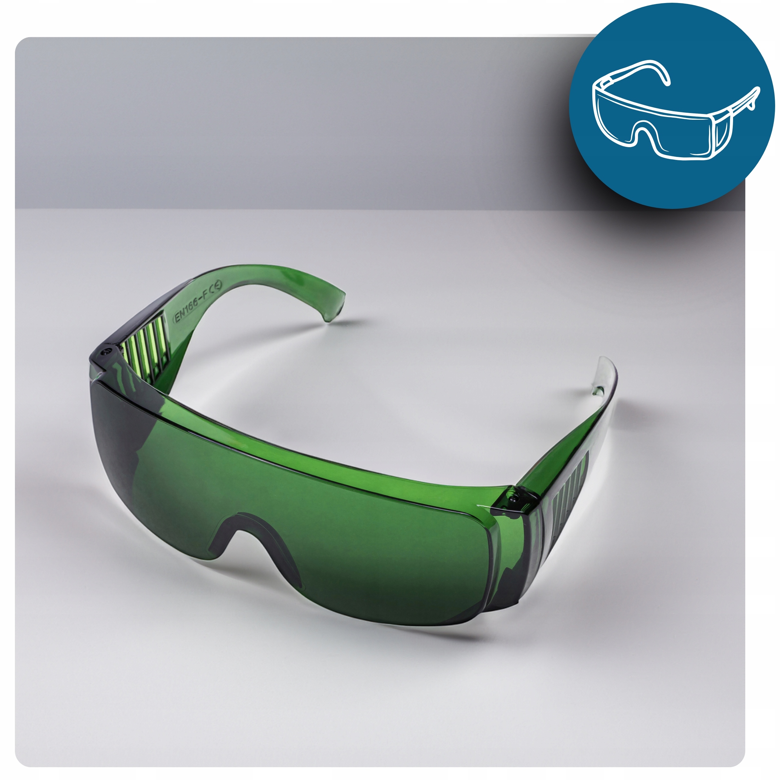 Zielone okulary laserowe poprawiają widoczność wiązki laserowej, co jest szczególnie pomocne w jasnych pomieszczeniach oraz na zewnątrz przy dużych odległościach.