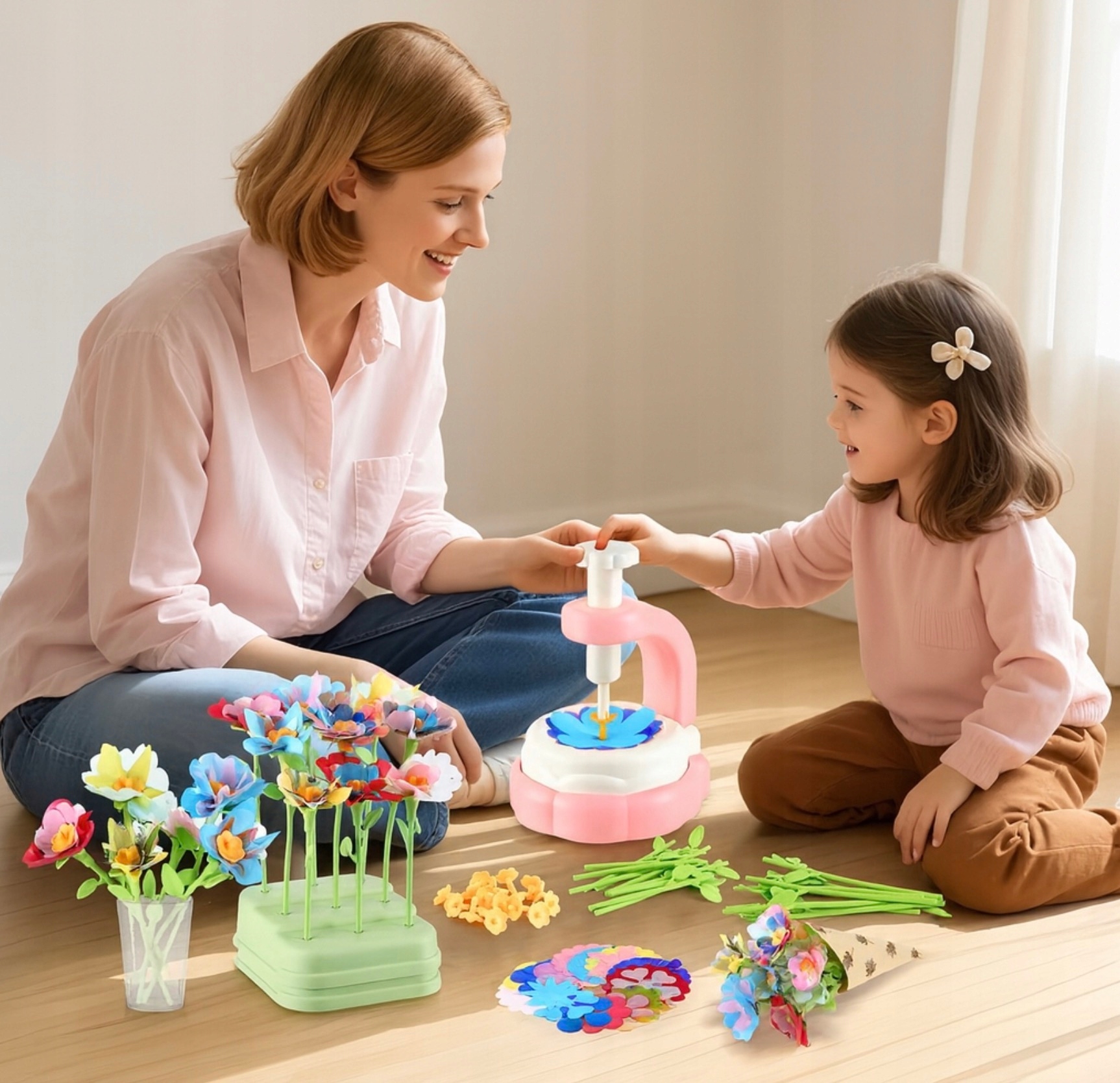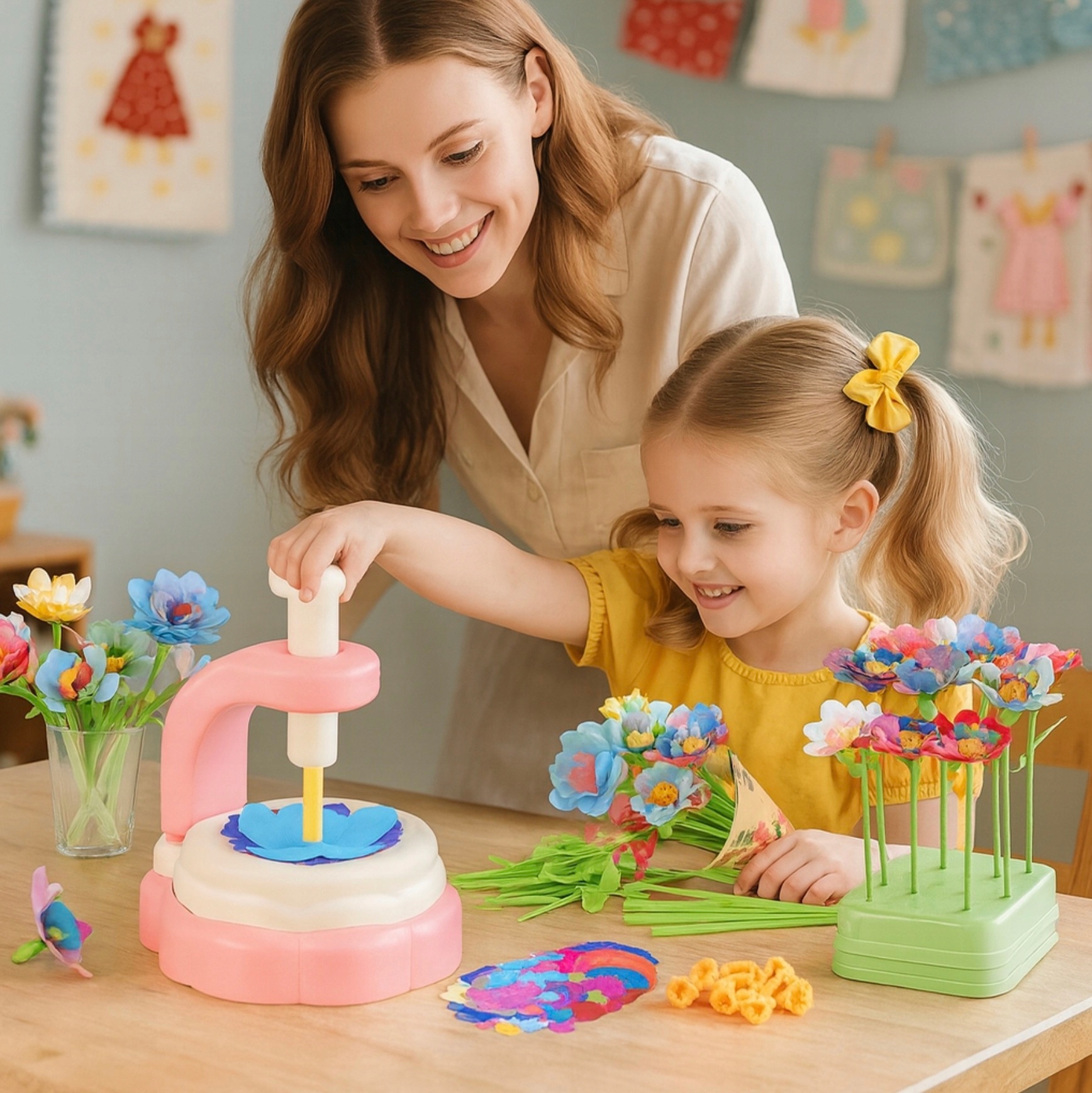 Zestaw kreatywny z maszynką do tworzenia kwiatów pozwala dziecku tworzyć kolorowe bukiety i dekoracje DIY. Ponad 160 elementów zapewnia długą i rozwijającą zabawę bez baterii.
