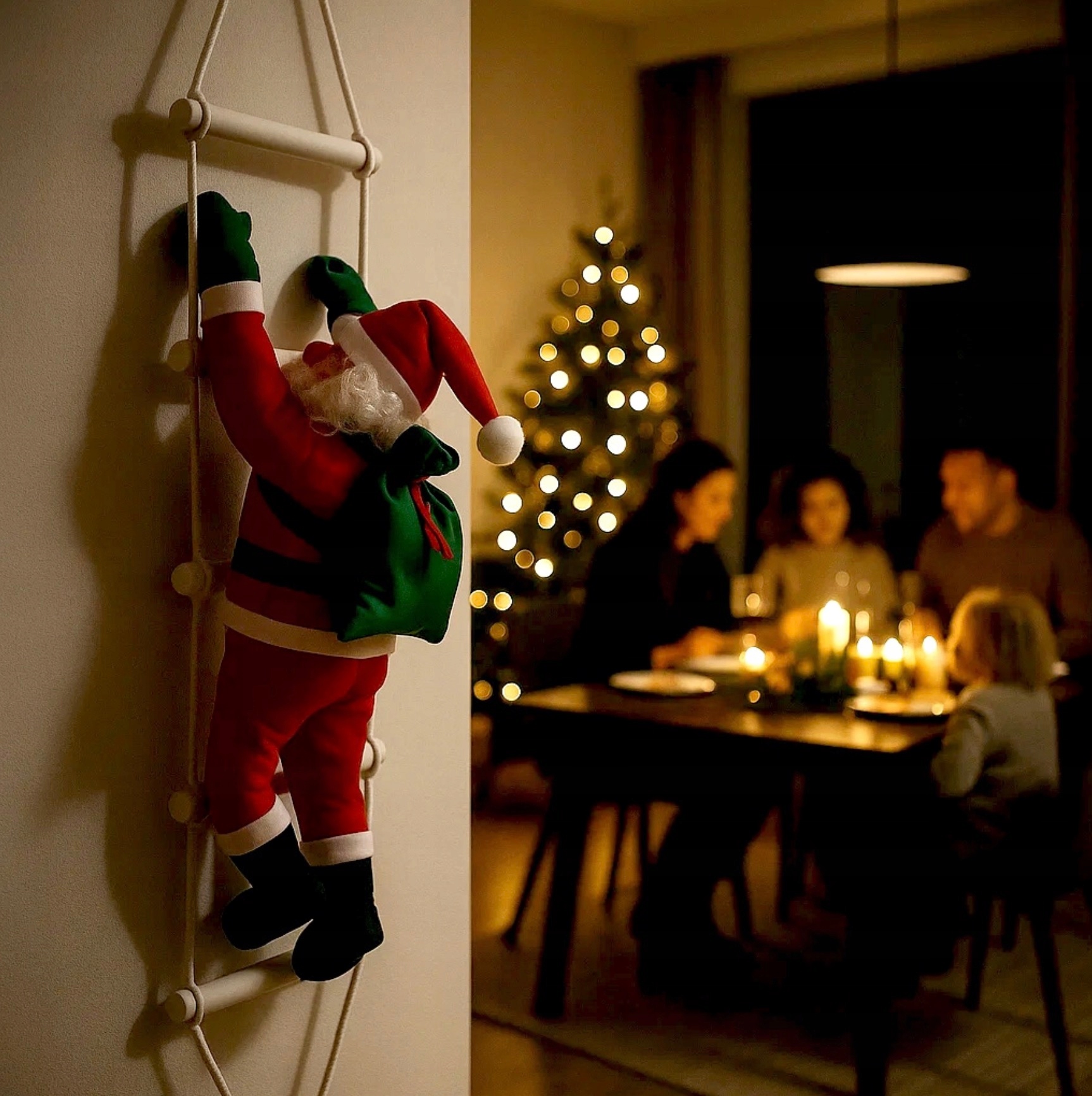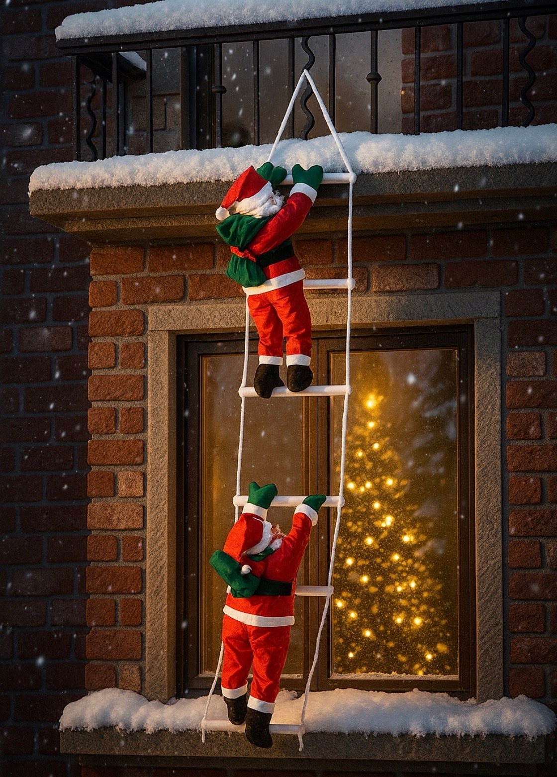 Wyobraź sobie zimowy wieczór. Za oknem śnieg, ciepłe światło z choinki odbija się w szybie, a tam — dwóch Mikołajów wspina się po białej drabinie prosto do Twojego domu.