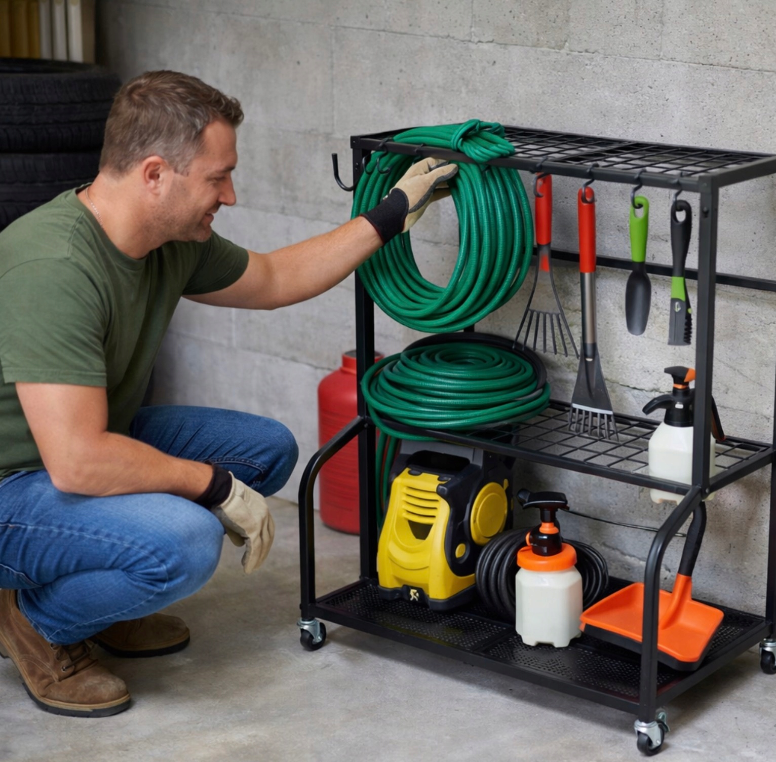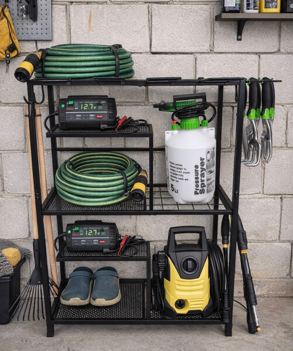 1️⃣ Ustaw stojak w garażu, szopie lub w ogrodzie.