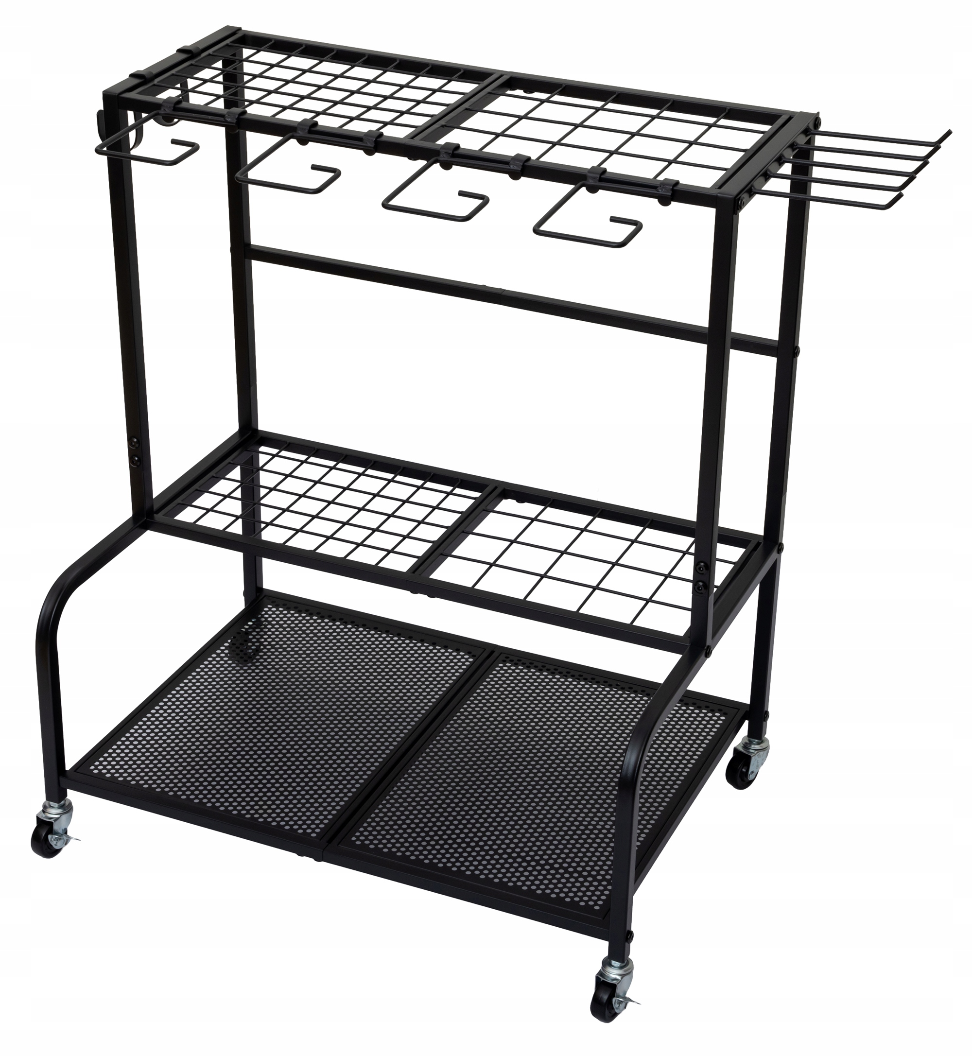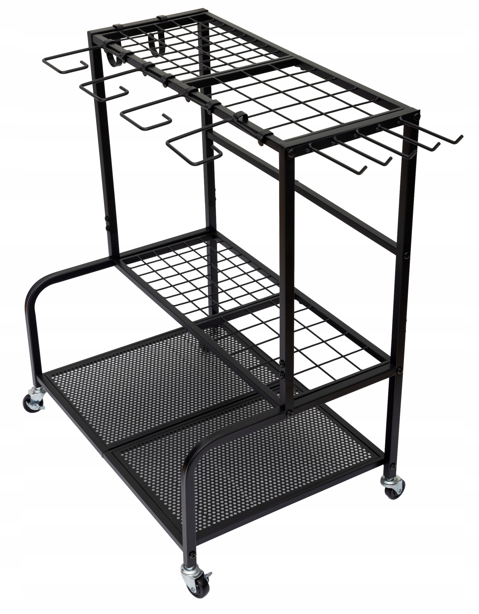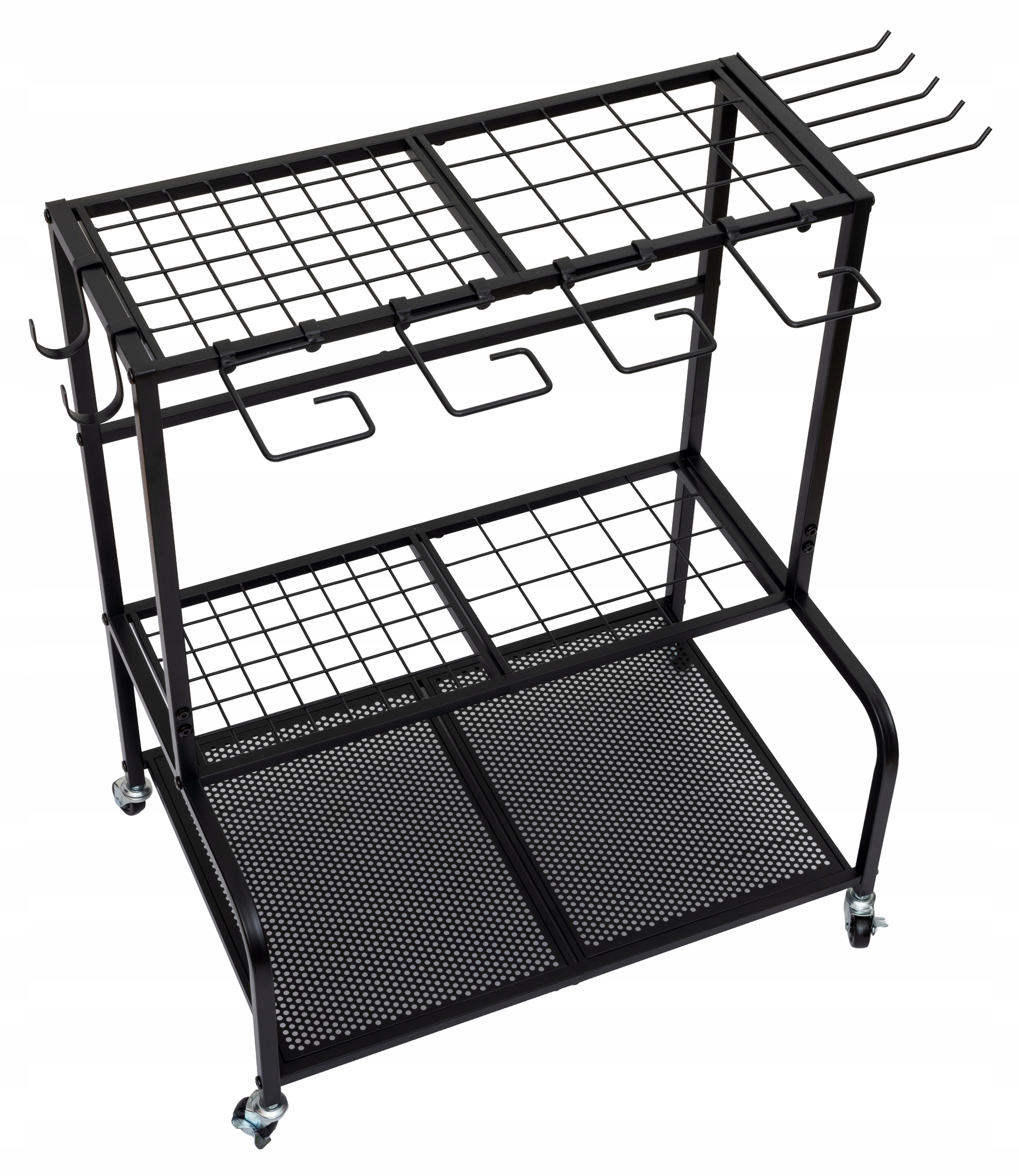 Metalowy stojak z trzema poziomami przechowywania oraz dodatkowymi haczykami umożliwia wygodne przechowywanie wielu narzędzi jednocześnie. Dzięki pionowej konstrukcji organizer zajmuje niewiele miejsca, a jednocześnie pozwala uporządkować nawet dużą kolekcję akcesoriów ogrodowych.