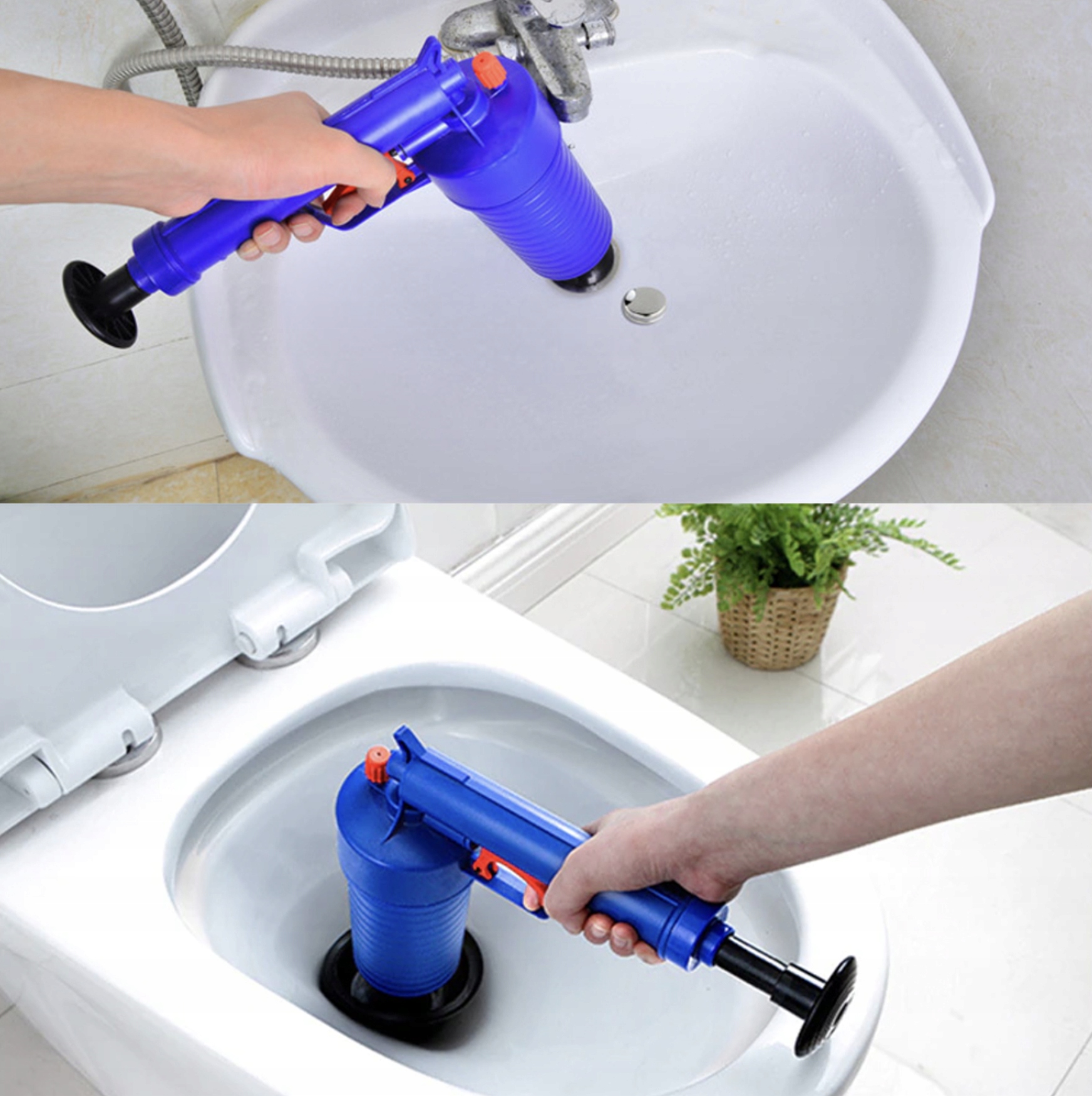 4️⃣ Naciśnij spust, aby uwolnić skumulowane powietrze. Powstała fala ciśnienia wypchnie zator w głąb rury.