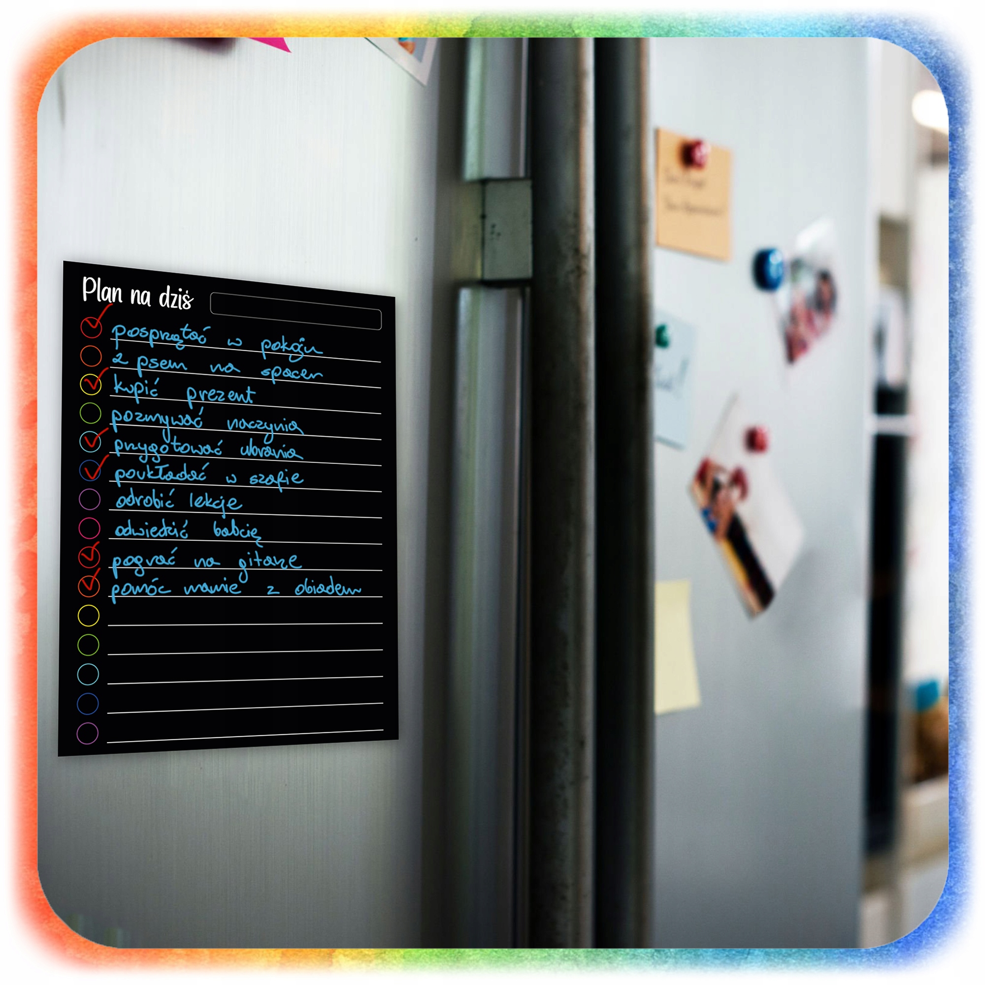 Kolory markerów wyglądają na czerni jak neonowe — czytelność jest idealna, a lodówka zyskuje designerski charakter.