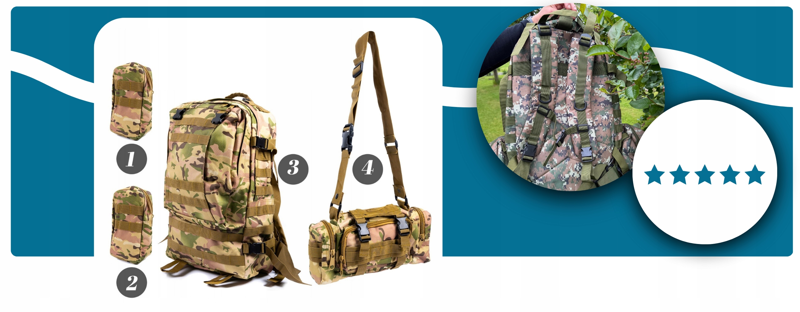 ➡️ Dodatki: szelki, pas biodrowy, uchwyt transportowy, system MOLLE, zwiększające funkcjonalność i komfort użytkowania.