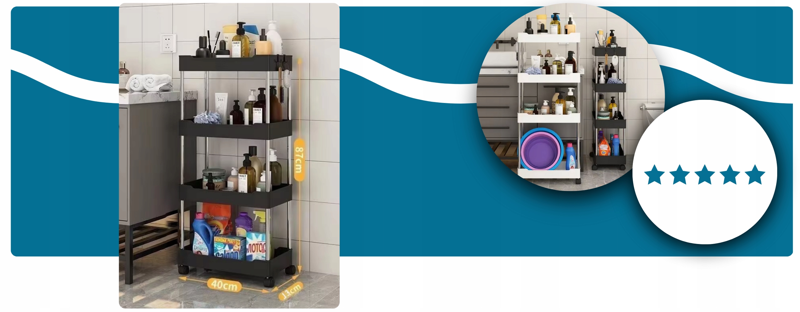 Ta wielofunkcyjna półka na kółkach to idealne rozwiązanie dla każdego, kto pragnie zapanować nad przestrzenią w swoim domu. Dzięki swojej mobilności i praktycznym półkom, pomoże Ci zorganizować zarówno łazienkę, kuchnię, jak i inne pomieszczenia.
