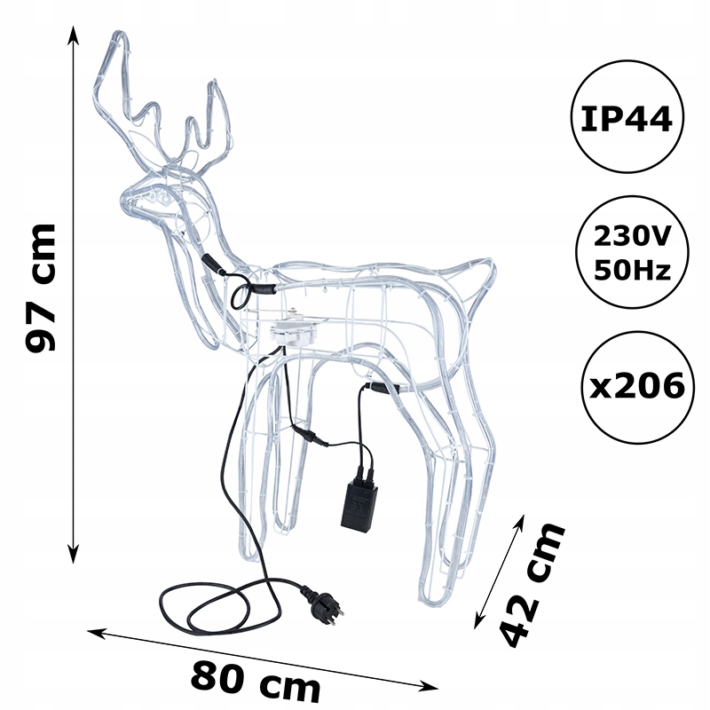 Świąteczny renifer LED z ruchomą głową i 216 diodami LED. Klasa IP44 – idealny na zewnątrz i do wnętrz. Eleganckie zimne światło i energooszczędność.