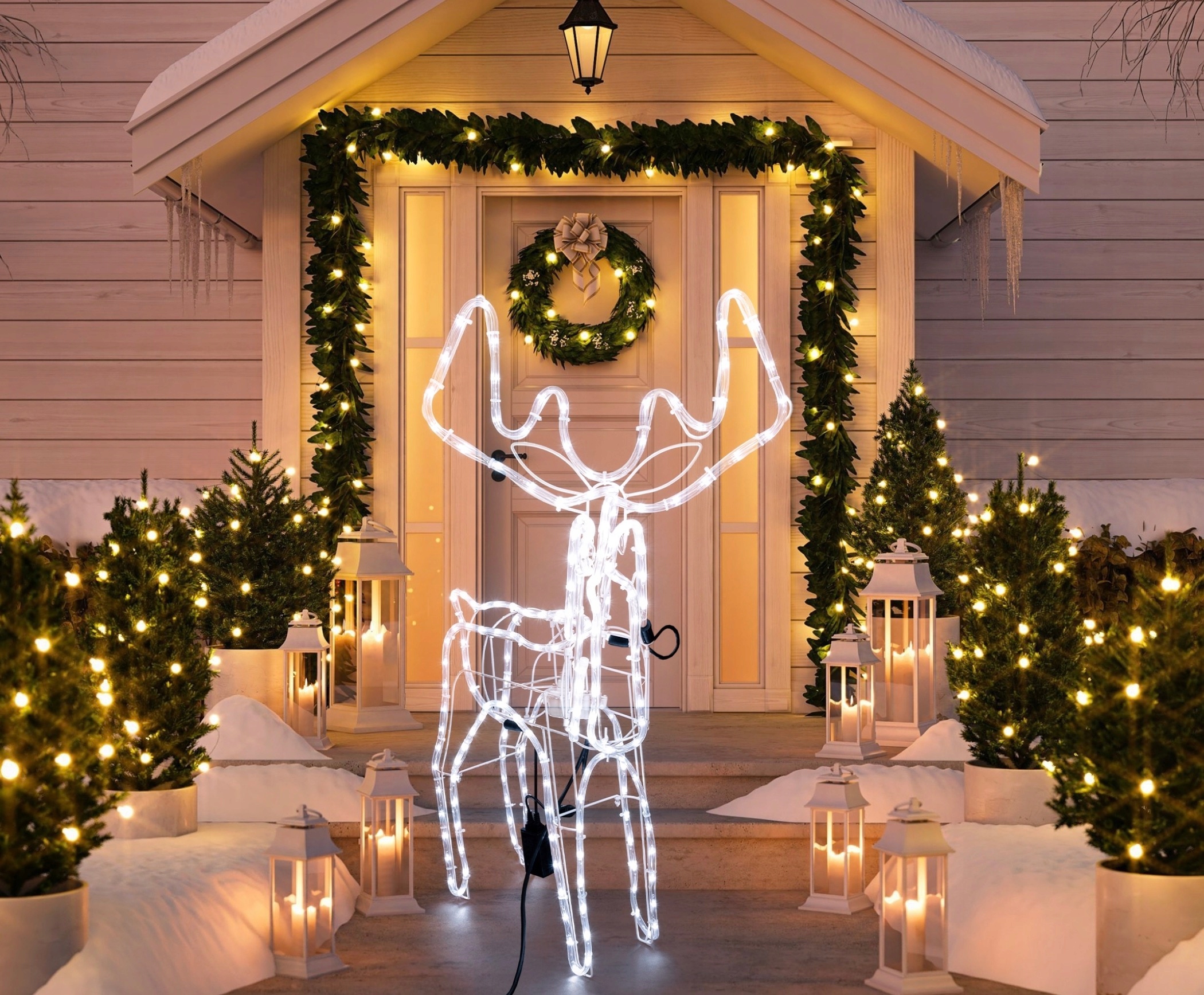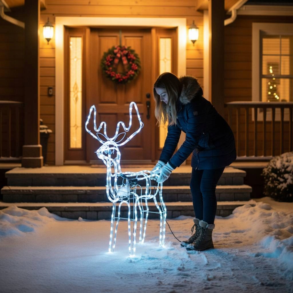 Wyobraź sobie zimowy wieczór – przed domem stoi świetlisty renifer, który lekko porusza głową, odbijając blask lampek i śniegu.