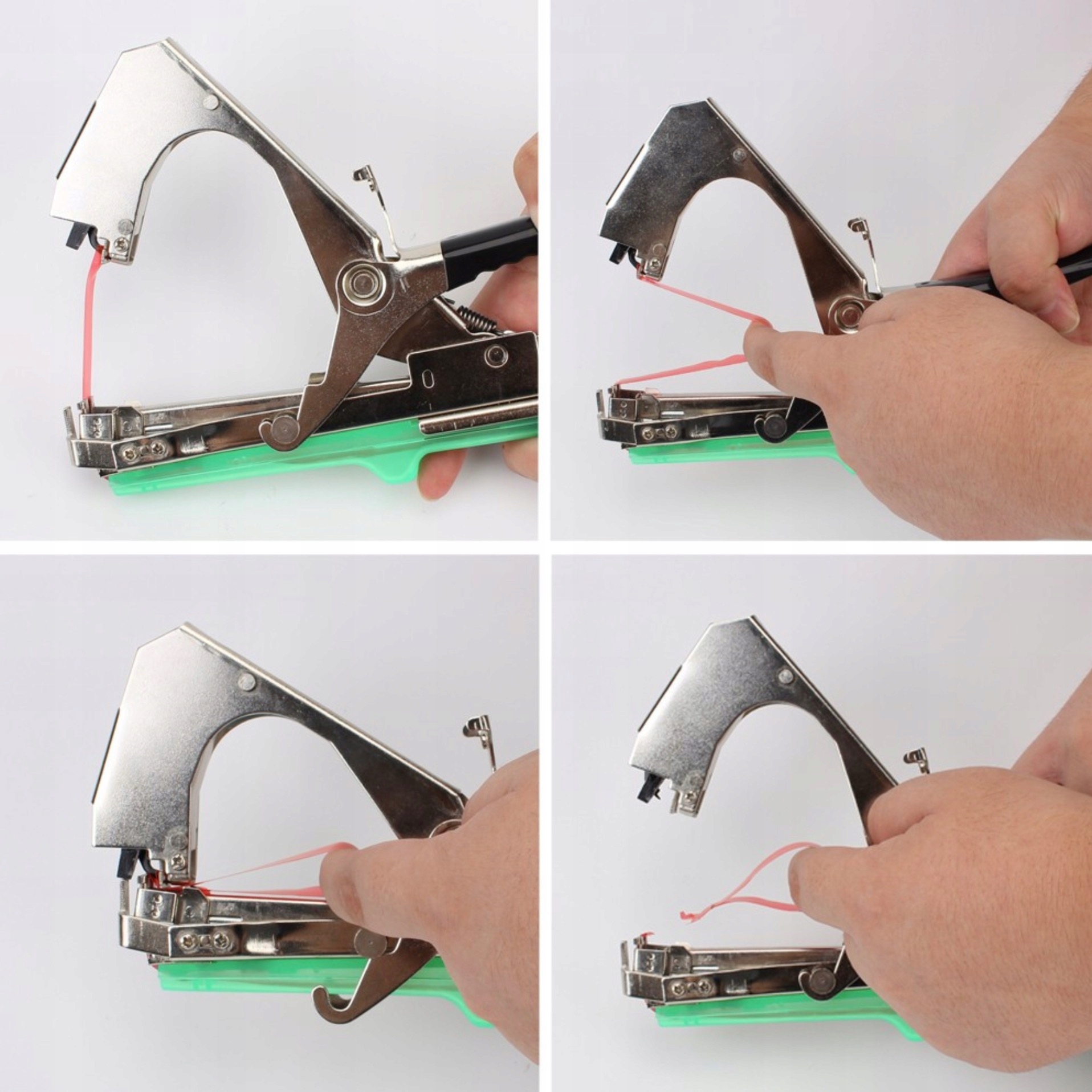 Wystarczy jedno naciśnięcie uchwytu, aby taśma została zamknięta zszywką i stabilnie połączyła roślinę z podporą.