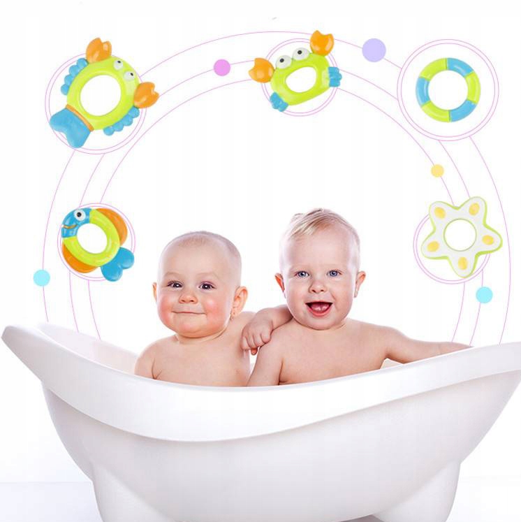 W zestawie znajdziemy różne zwierzątka morskie: kraba, rybkę, raka oraz gwiazdkę i kółeczko. Zabawka ćwiczy zręczność i koordynację, umila czas spędzony w wannie.