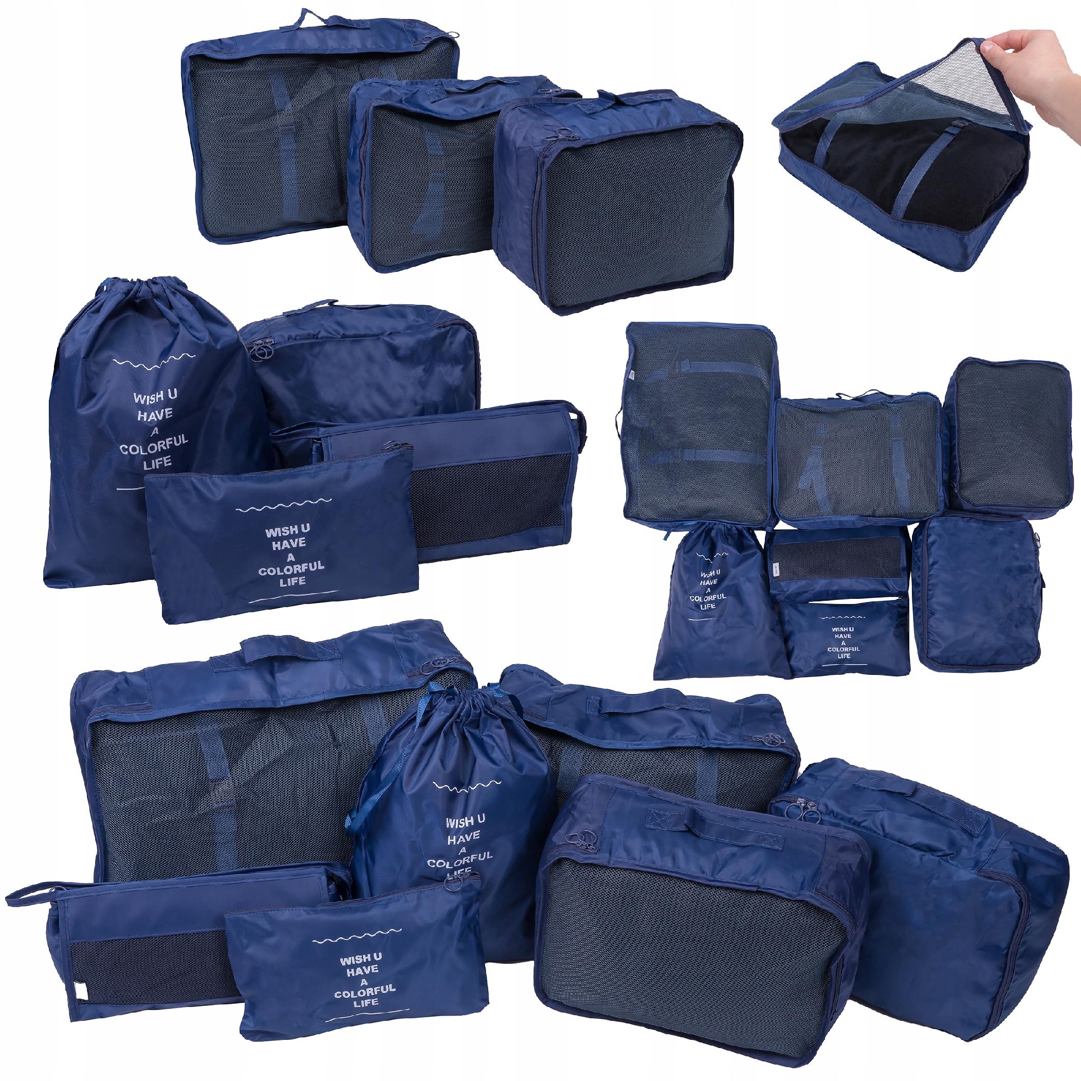 Zestaw składa się z ośmiu różnych organizerów, w tym saszetek na buty, kosmetyczki, torb z siatką i innych, co pozwala zorganizować przestrzeń w walizce według własnych potrzeb.
