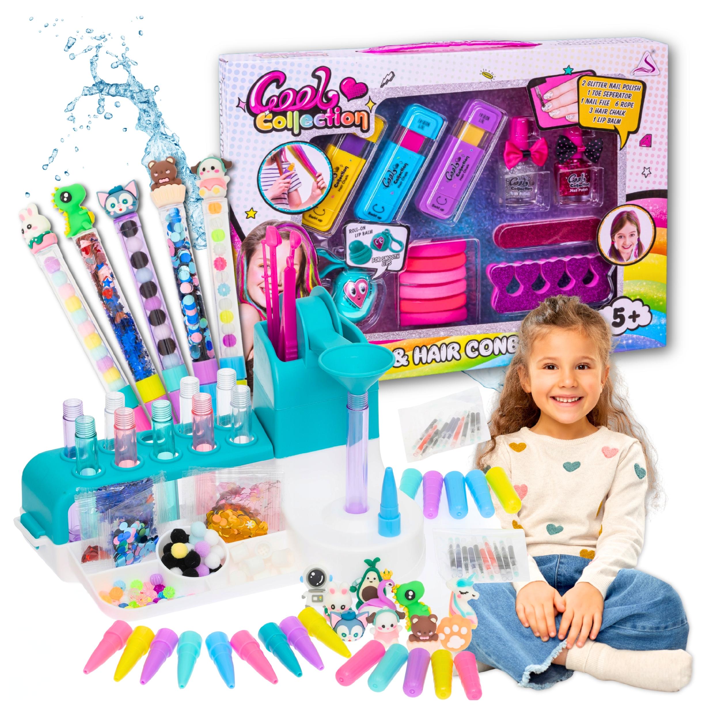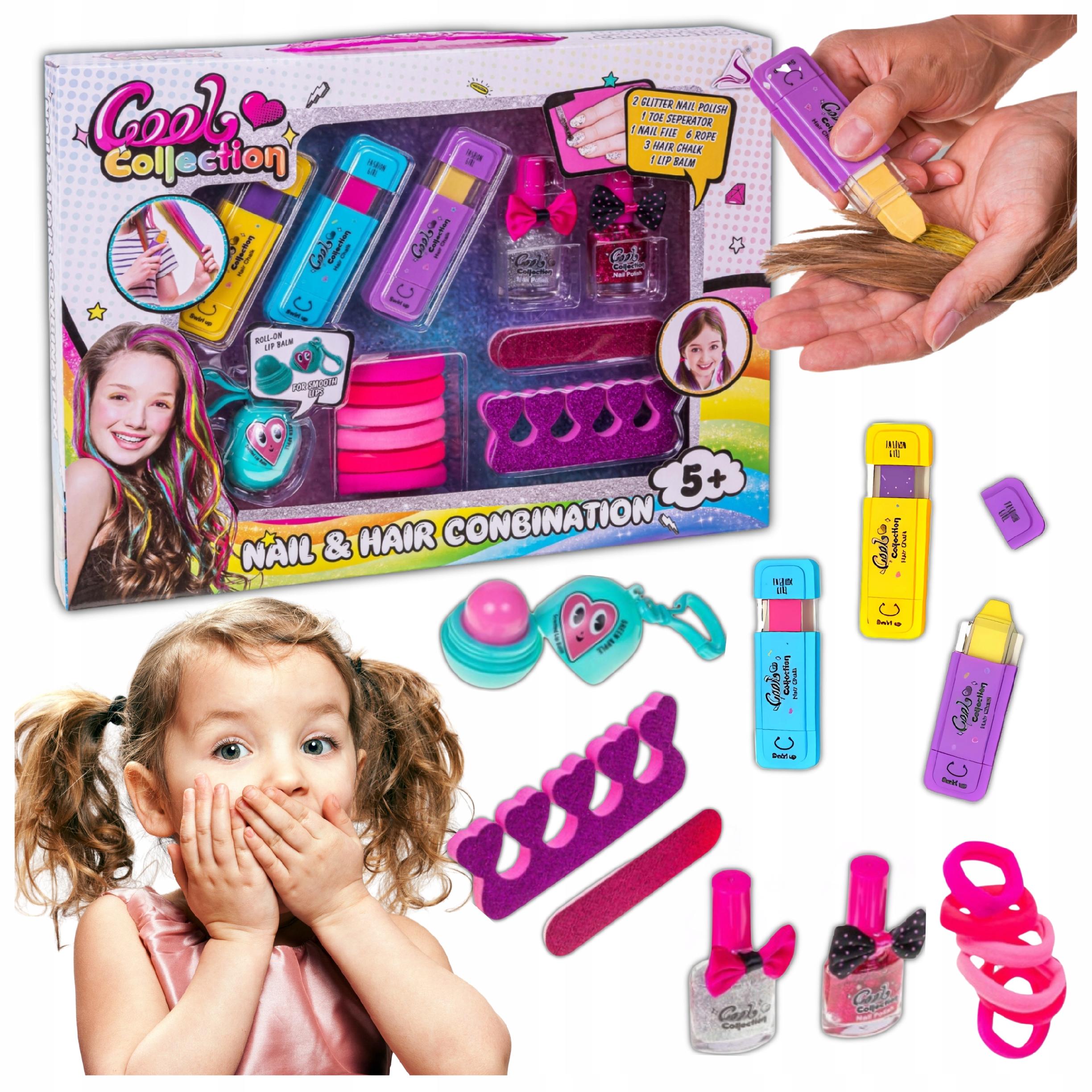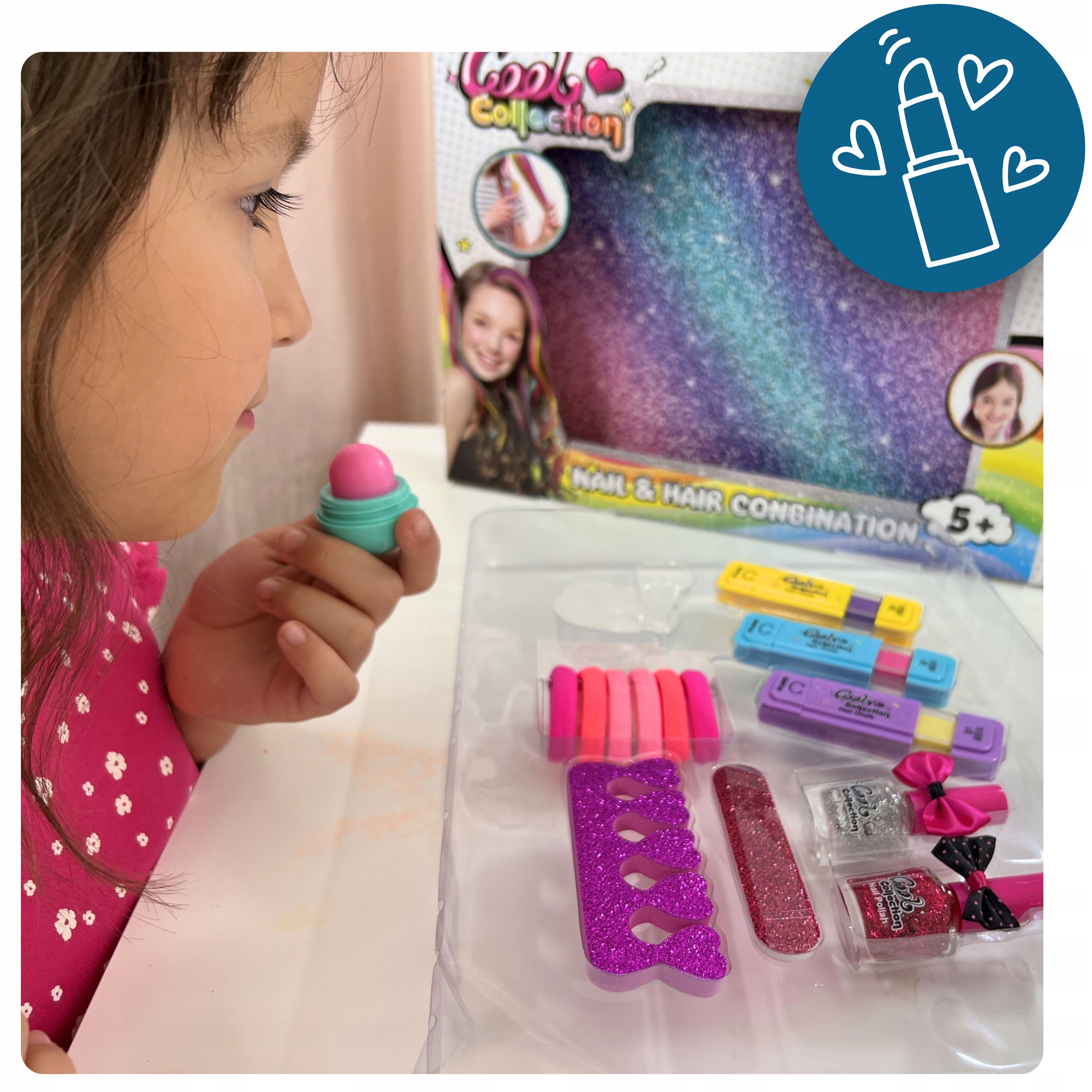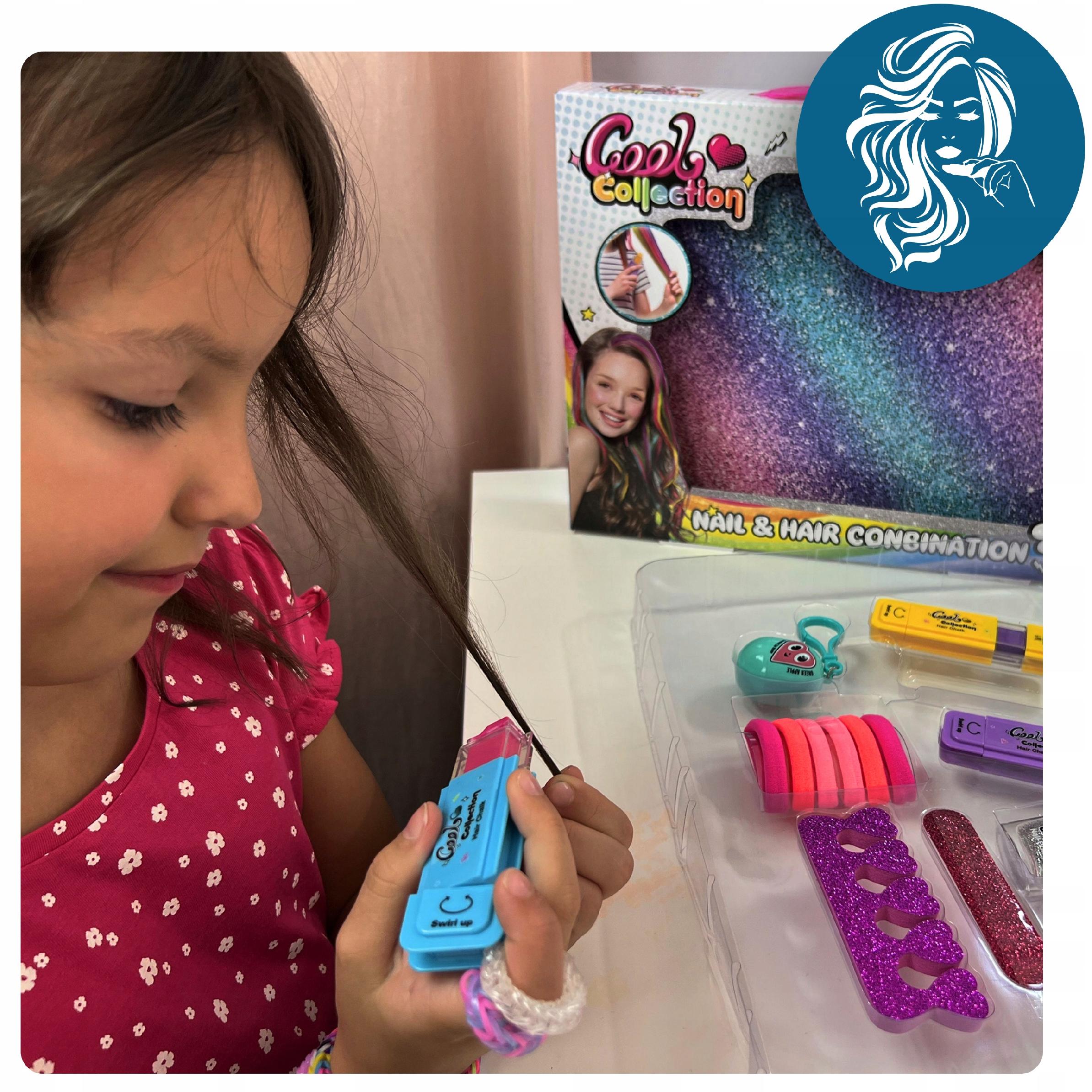 Zestaw pozwala na tworzenie różnorodnych stylizacji włosów, od delikatnych pasemek po intensywne kolory, a także na ozdobienie paznokci brokatowym lakierem.