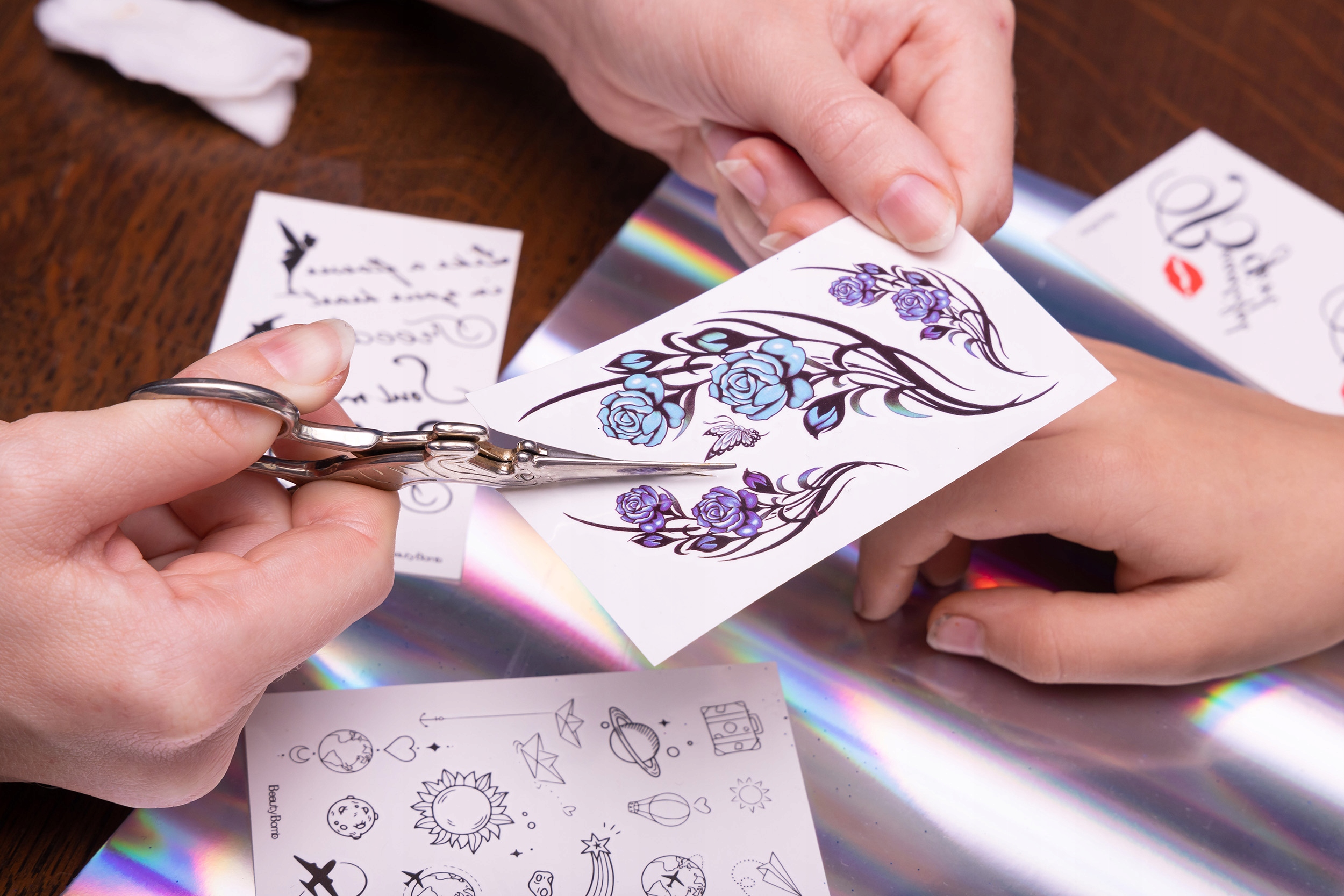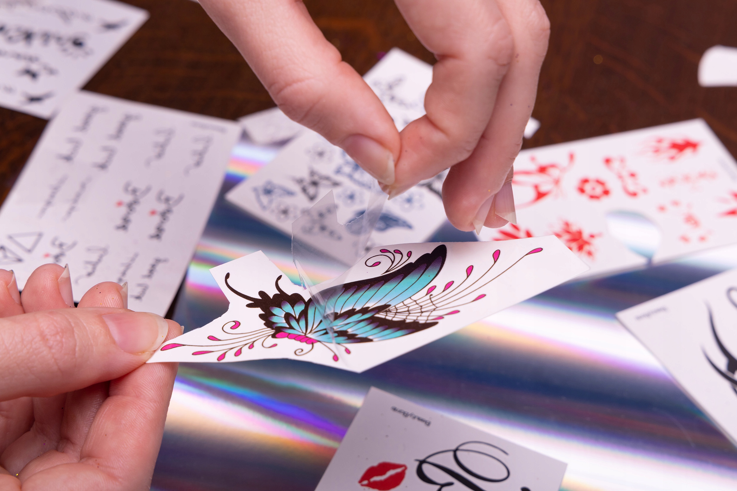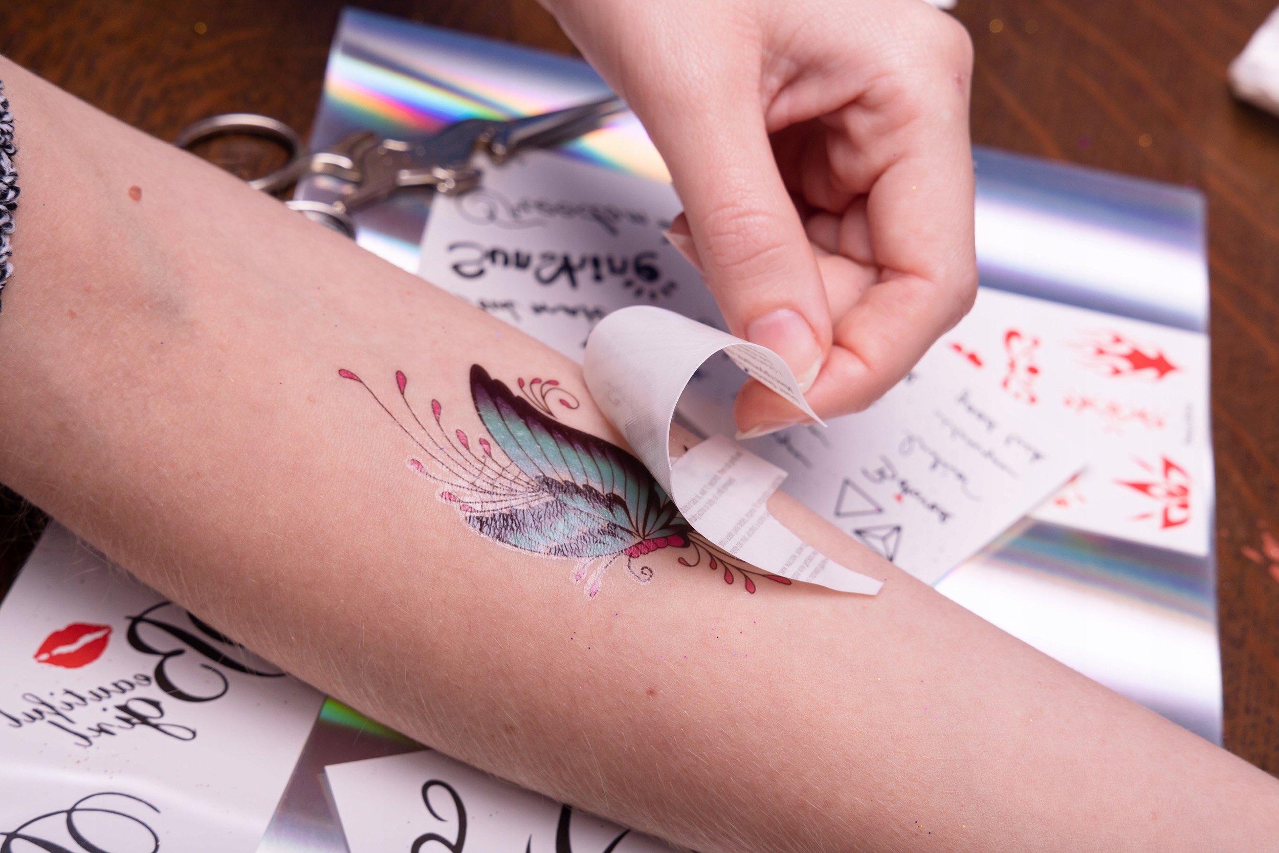 - Zdejmij folię ochronną z tatuażu samoprzylepnego