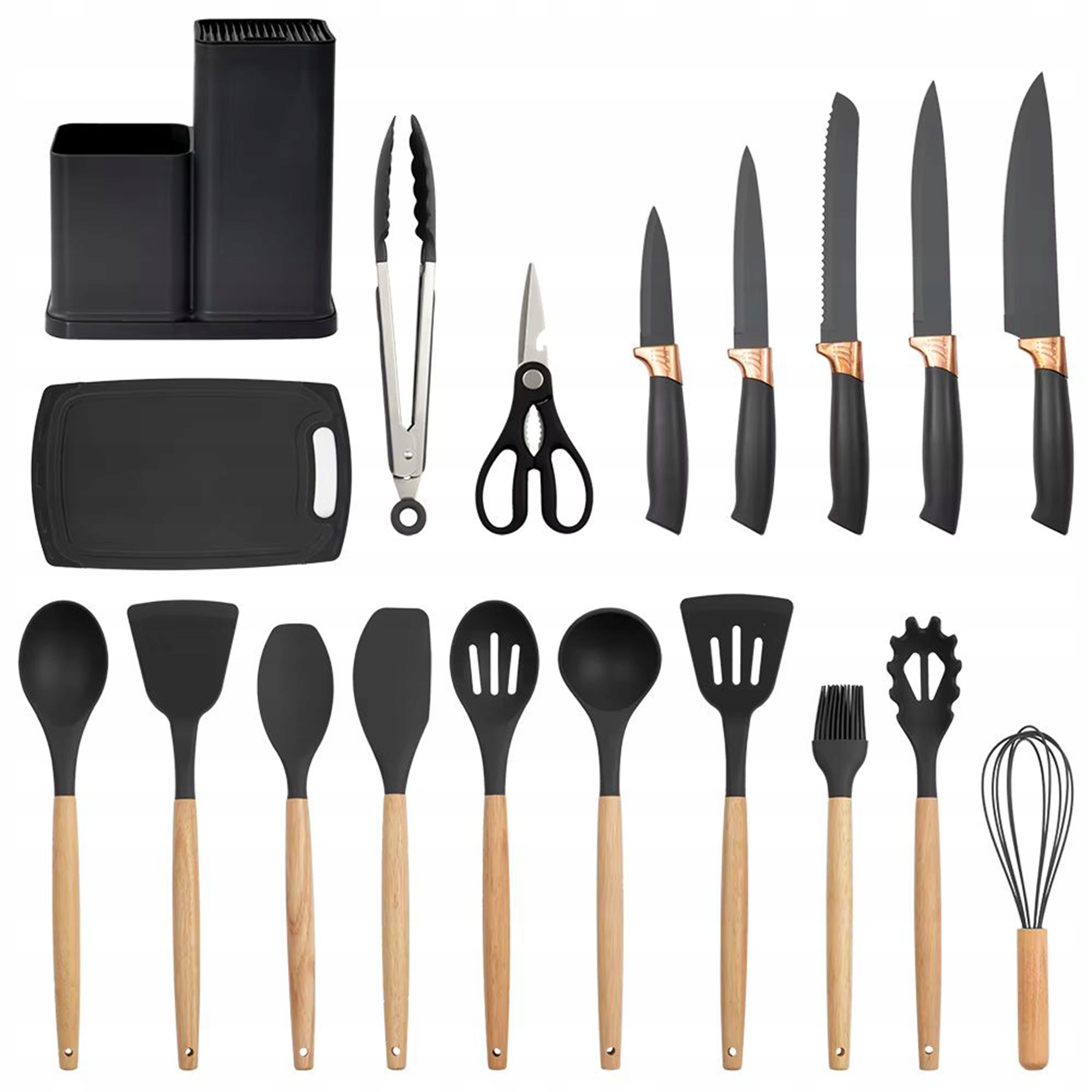 Zestaw noży kuchennych 19 elementów blok przybory silikonowe deska